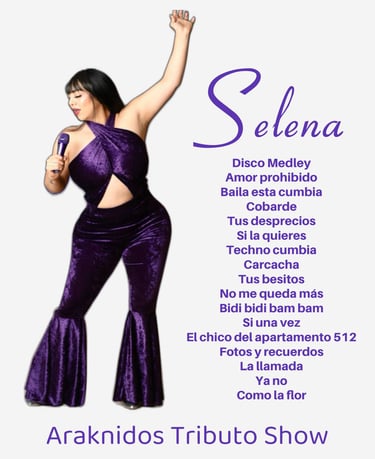 Selena Quintanilla, one of the most influential and beloved artists in Latin music, also known as the Queen of Tex-Mex. Selena is remembered for iconic hits such as “Bidi Bidi Bom Bom,” “Amor Prohibido,” and “Como La Flor.” Araknidos aims to keep her spirit and unmatched charisma alive through her greatest hits, honoring her music and story while introducing them to new generations of fans.